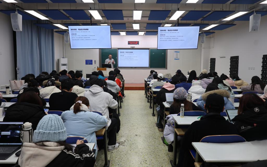 讲座中,郑洋围绕“低分习惯速览”和“答题误区拆解”两大板块展开深入分享:针对答题超时、内容偏离主题等常见不良应试习惯,逐一分析原因并给出可操作改进措施;在面试礼仪、答题逻辑方面,细致拆解误区,提醒同学们注重细节把控,提升应答针对性。最后,郑洋以两道经典面试真题为例,引导学生识别问题核心矛盾,明确答题立场,强化“回应群众需求、贴合实际场景”的答题思维。